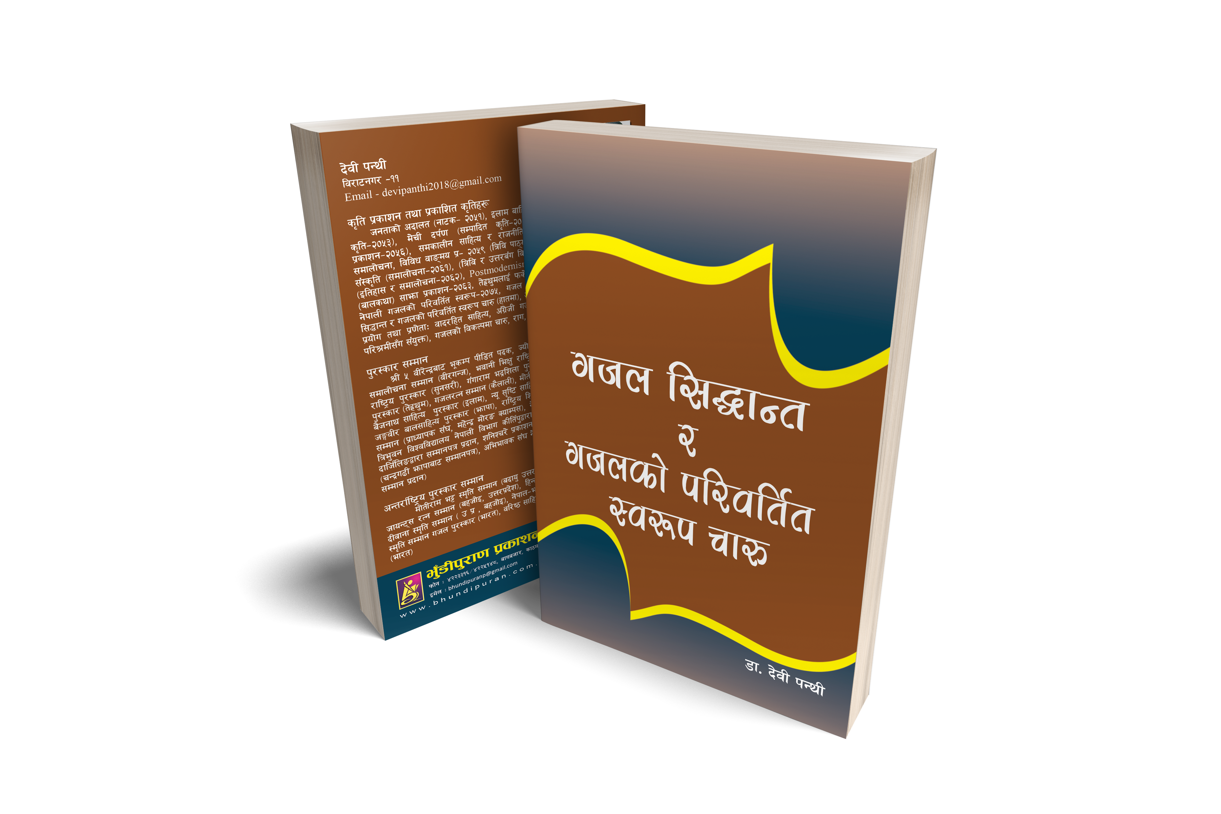 गजल सिद्धान्त र गजलको परिवर्तित स्वरूप चारु मूल्य रु. ४००/- भुँडीपुराण प्रकाशनको “गजल सिद्धान्त र गजलको परिवर्तित स्वरूप चारु” डा. देवी पन्थीद्वारा तयार पारिएको पुस्तक हो ।यस पुस्तकमा गजलको रूढ सिद्धान्तका साथै नेपाली र हिन्दी भाषामा चारु/राग, विरागको सिद्धान्त र परिभाषा विस्तृत रूपमा उल्लेख गरिएको छ । Post navigation Previous Previous post: आगो ओकल्ने पहाड (बाल कथासङ्ग्रह)Next Next post: थुनिएको जिन्दगी (कविता सङ्ग्रह)