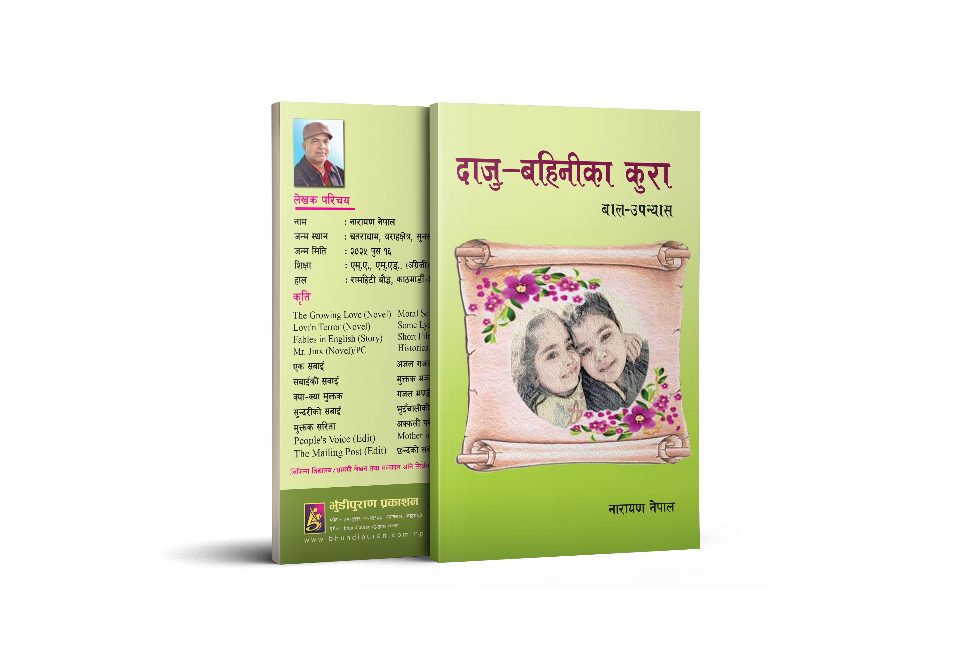 दाजु-बहिनीका कुरा (बाल उपन्यास) मूल्य रु. १००/- भुँडीपुराण प्रकाशनको “दाजु-बहिनीका कुरा” नारायण नेपालद्वारा तयार पारिएको बाल उपन्यास हो ।यस पुस्तकमा निकै रोचक ढङ्गबाट दुई दाजु बहिनीको कथा छोटो उपन्यासको रूपमा प्रस्तुत गरिएको छ ।यो पुस्तक बालबालिकाहरूका लागि निकै उपयोगी छ । Post navigation Previous Previous post: नेपालमा बुद्धधर्मको इतिहास (History of Buddhism in Nepal)Next Next post: प्रशान्तदोन (सन् १९६५ को नोबेल पुरस्कार प्राप्त उपन्यास)